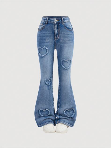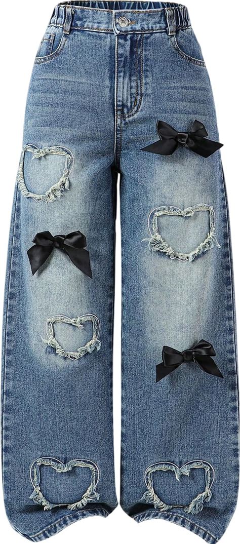 BEAUDRM Girl's Heart Patched Baggy Jeans Y2k Bow High Waisted Straight Leg Denim Pants Streetwear