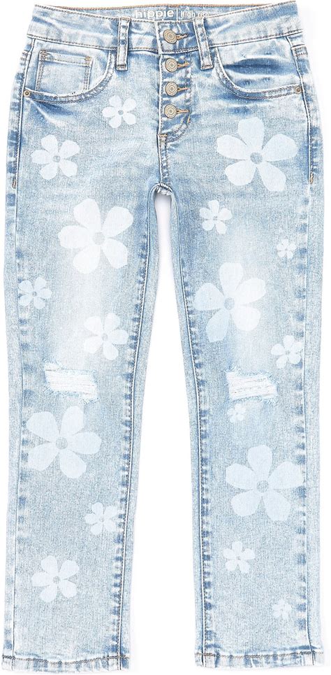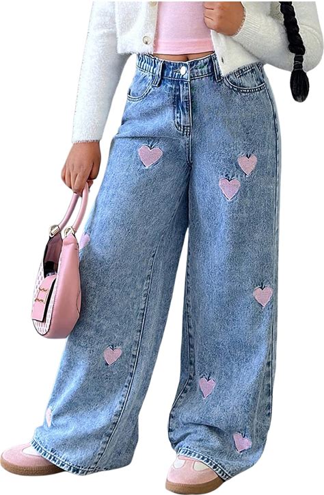 Fulihug Girls Jeans Baggy Wide Leg Ripped Denim Pants Heart & Flower Print High Elastic Waisted Y2K Skater Outfits 8-12Y