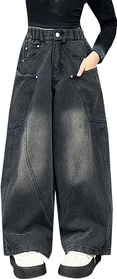 Girl/Tween Girls American Style High Street Washed Denim Jeans, Loose Wide Leg Casual Straight Pants, Flattering,13Y