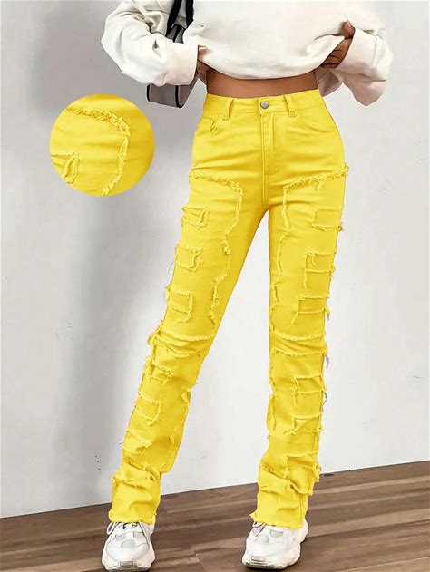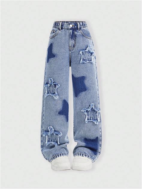 Cute Jeans For Teen Girls Star Embroidered Patchwork Pants Y2K High Waisted Straight Leg Baggy Jean Casual Preppy Demin Pants